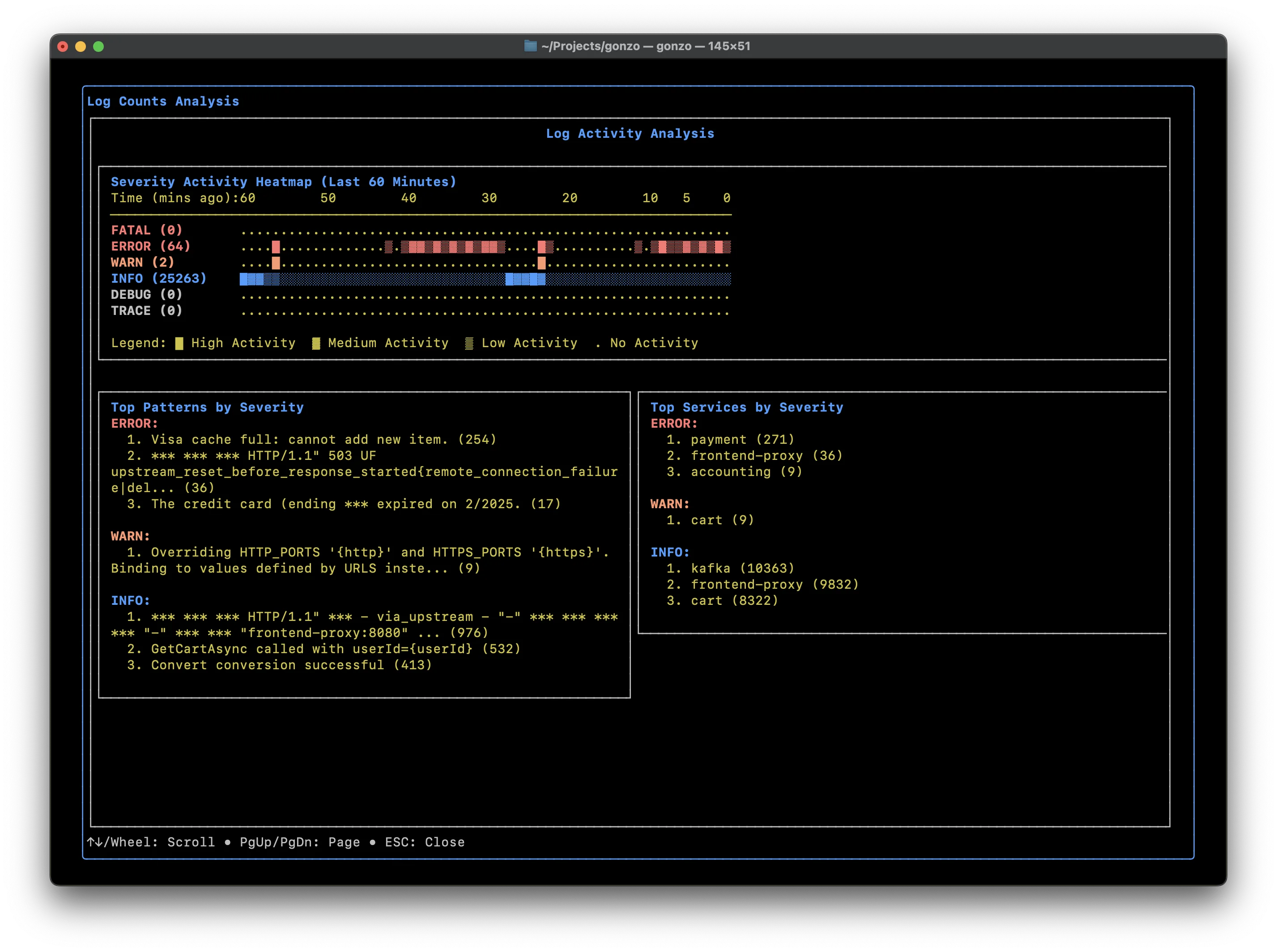 k9s. Analyze log streams with beautiful charts, AI-powered insights, and awesome filtering – all from your terminal.
