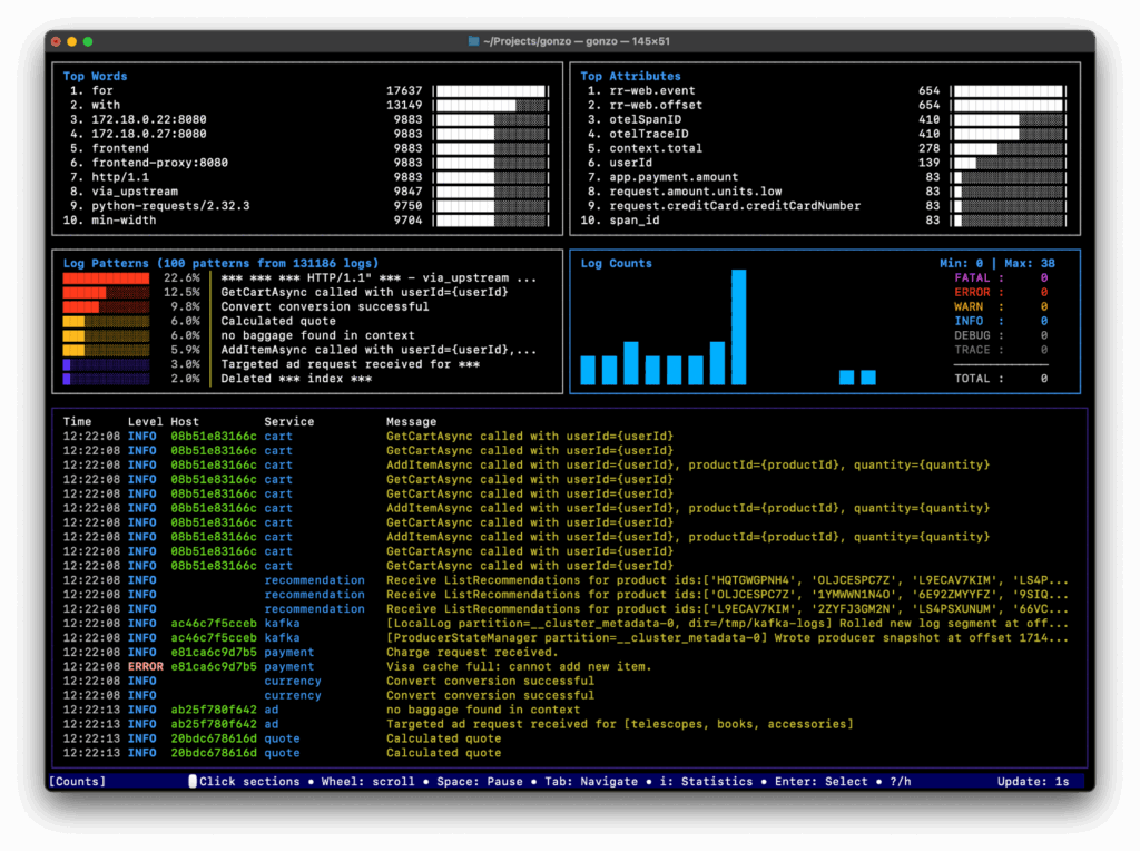 Gonzo introduced pattern-first, real-time log analysis in the terminal. It streams and auto-detects logs across multiple formats with native OpenTelemetry support, groups patterns, and highlights outliers with heatmaps and severity tracking, all with minimal friction.