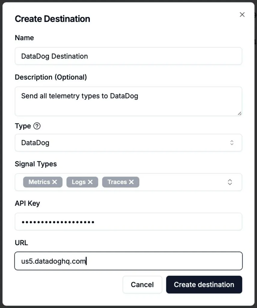 Sending your telemetry data to DataDog as a destination for all signal types is straightforward using the DataDog exporter. You may add DataDog as a destination in ControlTheory by navigating to “Destinations” in the left hand navigation and selecting the “DataDog” destination type. You will then be prompted for your DataDog URL (e.g. “us5.datadoghq.com“) and API key. Once created, this destination can then be leveraged in your pipelines and configurations.