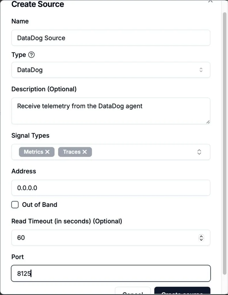 You can then include the DataDog source in a (metrics or traces) pipeline and configuration and apply that to a collector/agent – for “dual shipping” you could send this telemetry to a NOP (dev/null) destination for example to get started and analyze the traffic coming from DataDog.