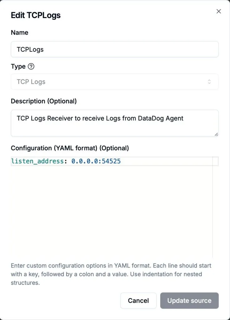 To create a source/receiver inside of ControlTheory, navigate to “Sources” in the left hand navigation and create a new source for DataDog. Configure the endpoint the receiver should listent on (e.g. 0.0.0.0