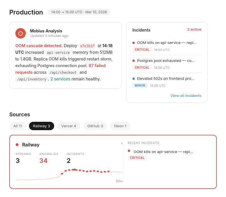 No native Railway alerting means you need a layer that watches the log stream on your behalf. Mobius monitors continuously, detects anomalous patterns, and surfaces a diagnosis — description, evidence, and a prioritized action list — before you go looking.