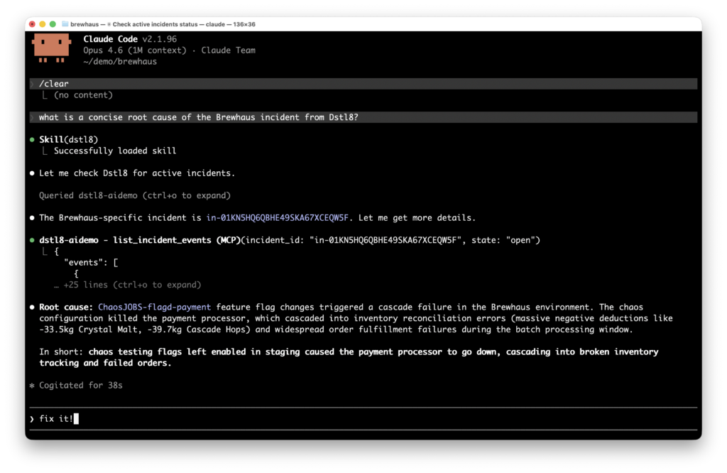 Dstl8 groups related failures, surfaces likely root cause, and gives a fix-oriented narrative. Through MCP integration, you can ask questions about incidents directly from your editor without switching contexts.