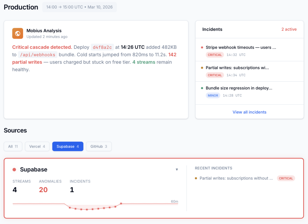 An Auth brute-force attempt, a Postgres connection storm, or a wave of Edge Function exceptions all require someone to be looking. There is no built-in incident narrative that says these events are related, escalating, and probably caused by the same broken path.